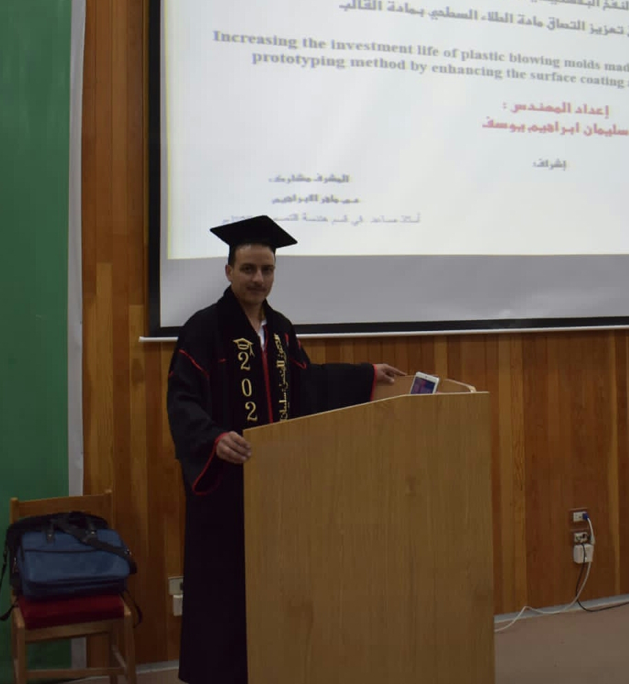نوقشت في قسم هندسة التصميم والإنتاج في كلية الهندسة الميكانيكية والكهربائية بجامعة حمص رسالة الدكتوراه للمهندس سليمان إبراهيم يوسف بعنوان ” زيادة العمر الاستثماري لقوالب النفخ البلاستيكية المصنعة من مواد لدائنية بطريقة النمذجة السريعة عن طريق تعزيز التصاق مادة الطلاء السطحي بمادة القالب ” بإشراف الدكتور محمود الأسعد (مشرفاً علمياً)، والدكتور ماهر الإبراهيم (مشرفاً مشاركاً).