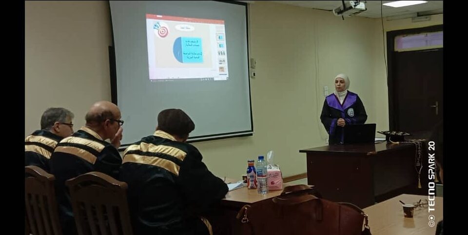 تألفت لجنة الحكم والمناقشة من السادة الدكاترة: جمال العلي رئيساً، يسرى حسن مشرفاً، فادي العمار عضواً.