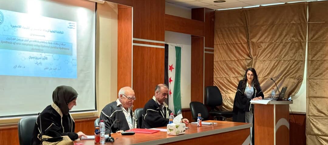 نوقشت في قسم الكيمياء في كلية العلوم بجامعة حمص رسالة الماجستير للباحثة نسرين جرجس دميان تحت عنوان: “اصطناع معقدات جديدة باستخدام مشتقات دي فينيل بيريدين هيدرازون”.