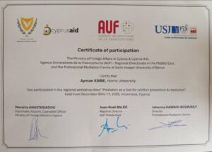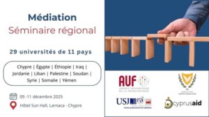 وجاءت هذه الورشة في إطار أنشطة التدريب المستمرة في مجال الوساطة التي تقدمها المديرية الإقليمية للوكالة الجامعية الفرنكوفونية، وهدفت إلى تطوير قدرات الأكاديميين الجامعيين في مختلف التخصصات والمؤسسات في منطقة الشرق الأوسط، ولا سيما أولئك الذين قد يشاركون في أنشطة الوساطة داخل الجامعات.