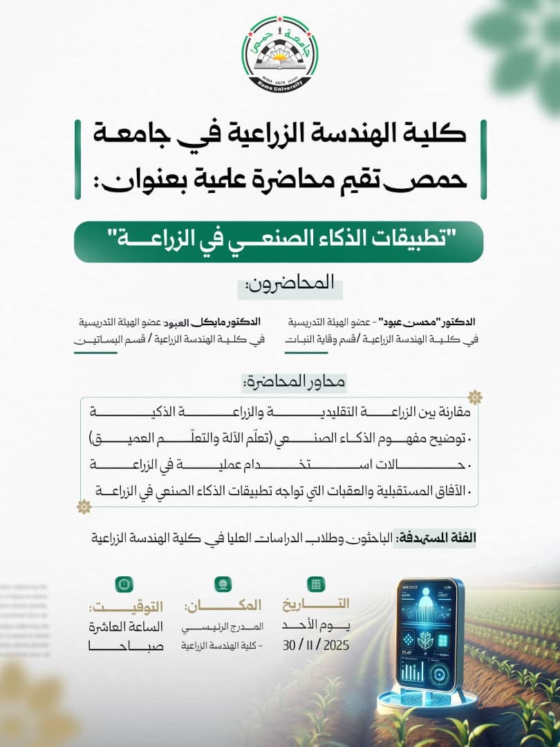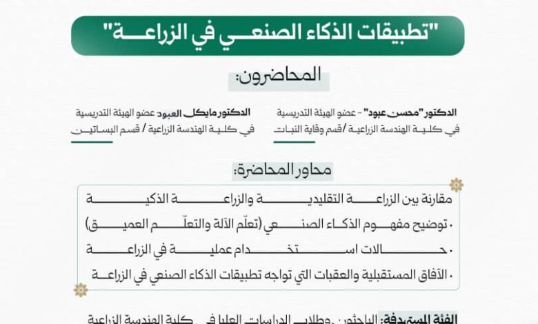 أخبار عامةإعلاناتشريط الأخبارندوات ومؤتمرات محاضرة علمية بعنوان تطبيقات الذكاء الصنعي في الزراعة الخميس 6 جمادى الآخرة 1447هـ 27-11-2025م 24 الخميس 6 جمادى الآخرة 1447هـ 27-11-2025م 24