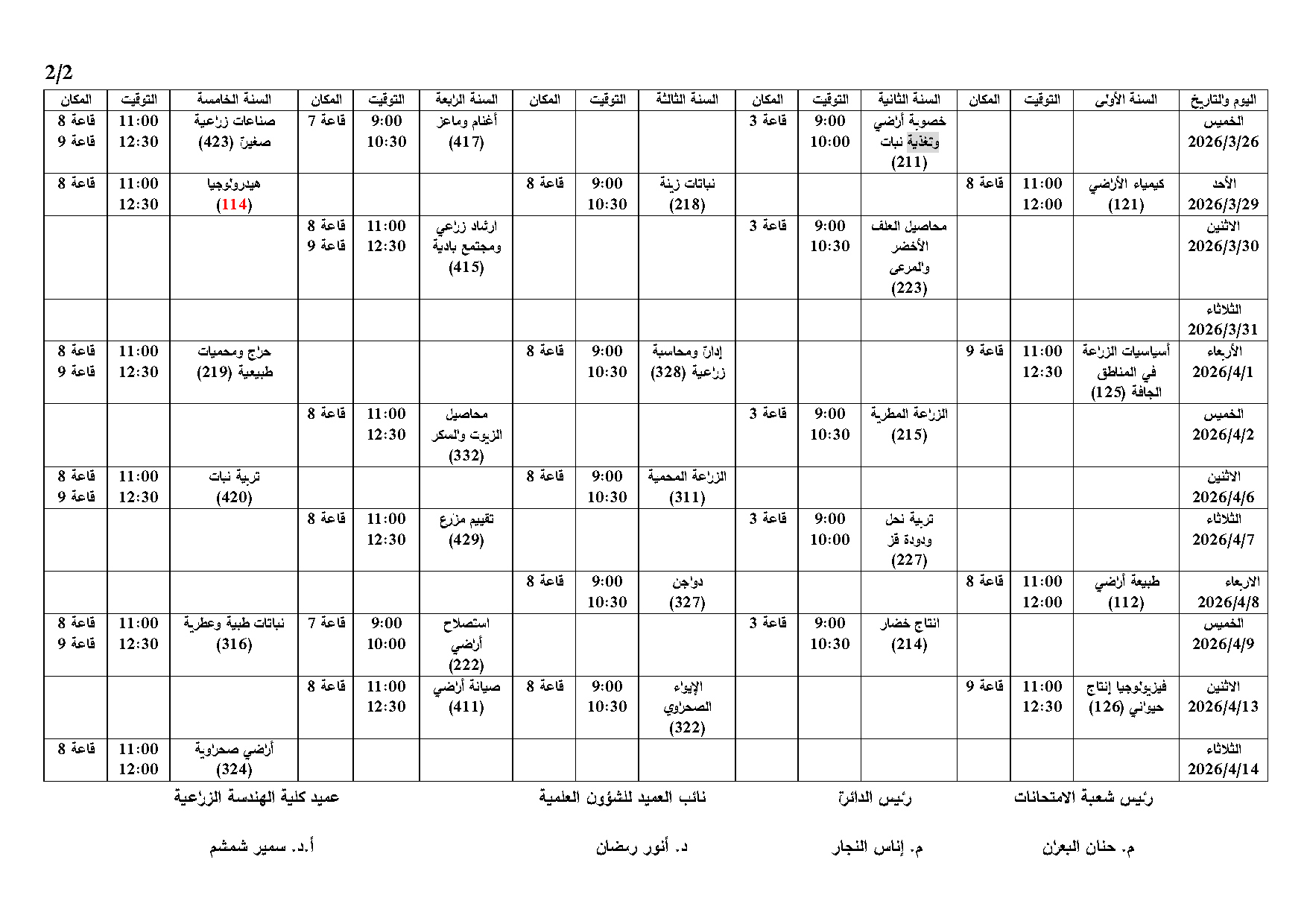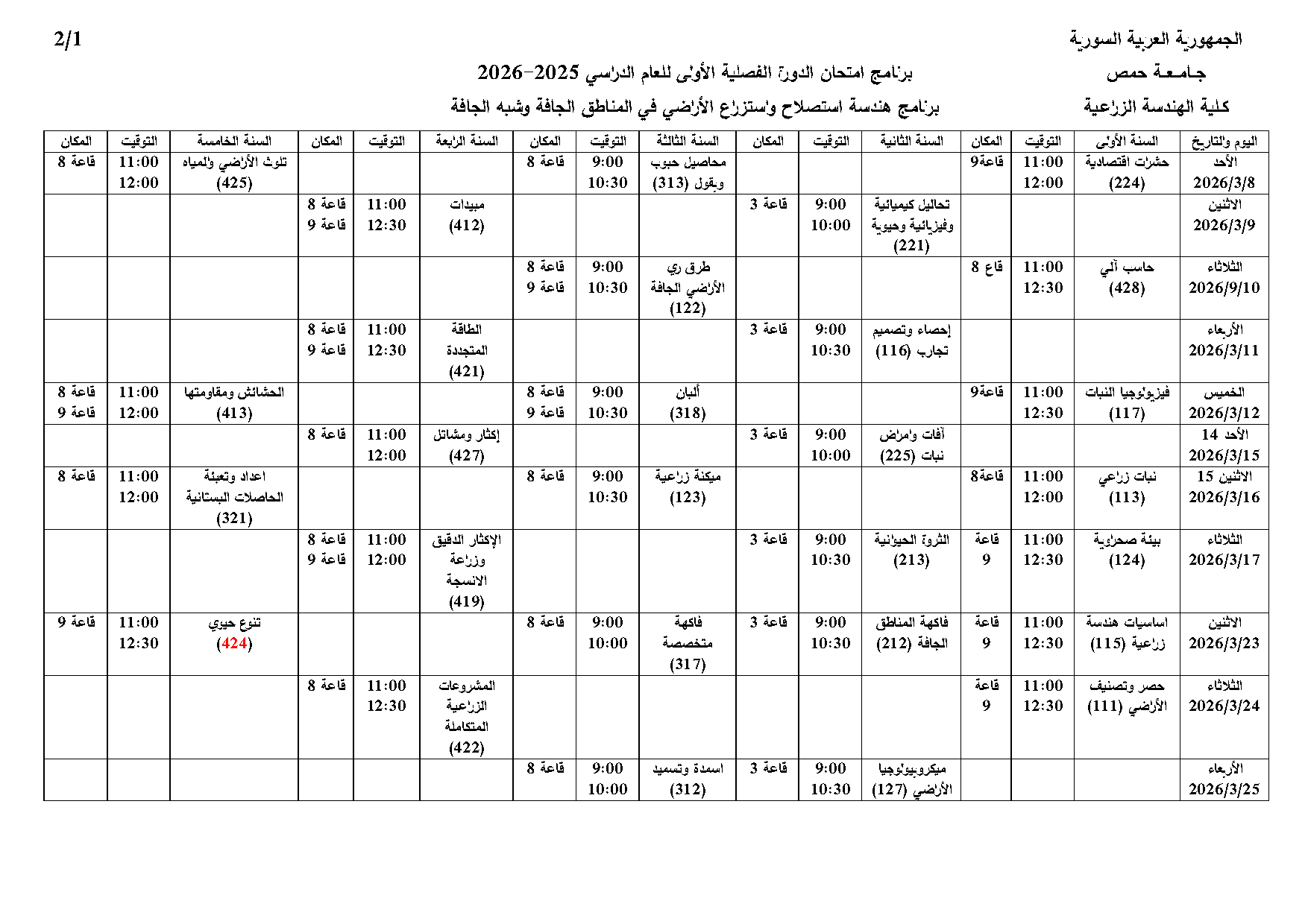 برنامج امتحان الدورة الفصلية الأولى 2025-2026 (التعليم المفتوح) لبرنامج هندسة استصلاح واستزراع الأراضي