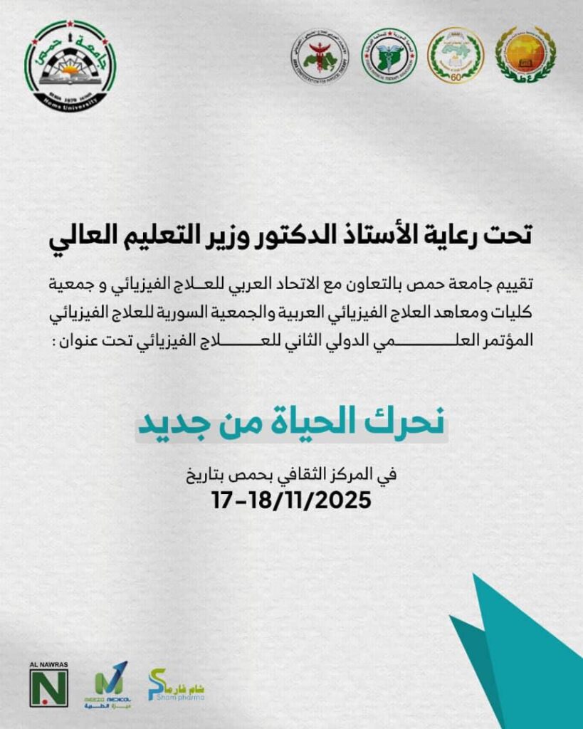 تُنظم جامعة حمص المؤتمر العلمي الدولي الثاني للعلاج الفيزيائي تحت عنوان (نحرّك الحياة من جديد)، وذلك بالتعاون مع الاتحاد العربي للعلاج الفيزيائي، وجمعية كليات ومعاهد العلاج الفيزيائي العربية، والجمعية السورية للمعالجة الفيزيائية.
