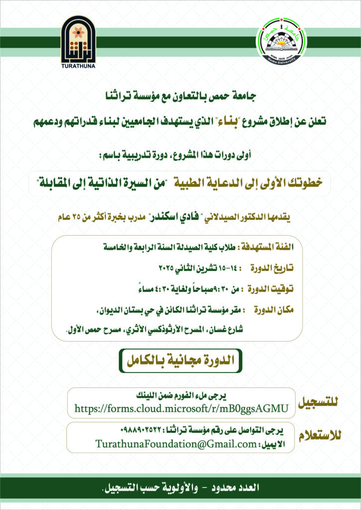 جامعة حمص بالتعاون مع مؤسسة تراثنا عن اطلاق مشروع بناء الذي يستهدف الجامعيين لبناء قدراتهم ودعمهم