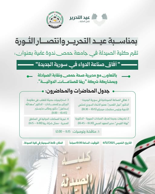 - بمناسبة عيد التحرير وانتصار الثورة، ندوة علمية بعنوان “آفاق صناعة الدواء في سورية الجديدة” في كلية الصيدلة بجامعة حمص