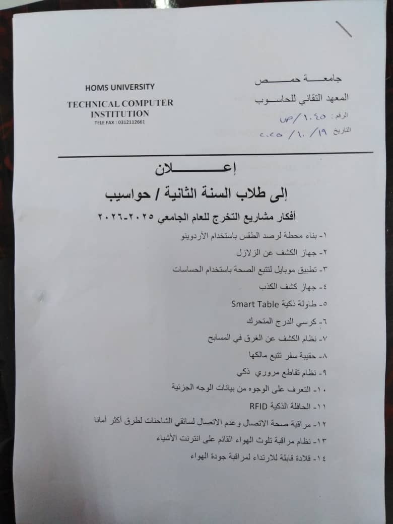 اعلان الى طلاب السنة الثانية قسم حواسيب (أفكار مشاريع تخرج للعام الدراسي2025/2026)