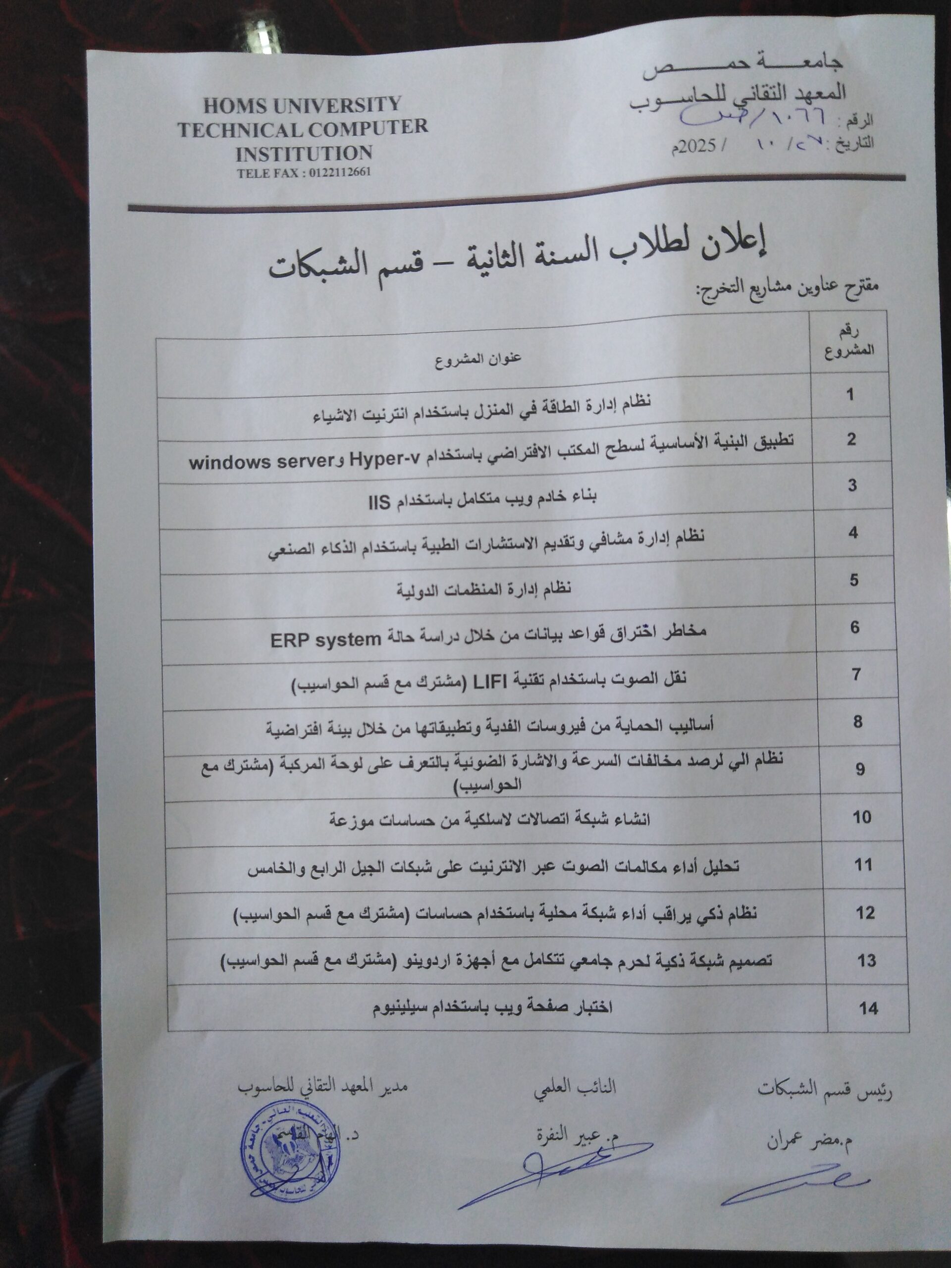 اعلان افكار مشاريع التخرج لطلاب السنة الثانية(قسم شبكات )