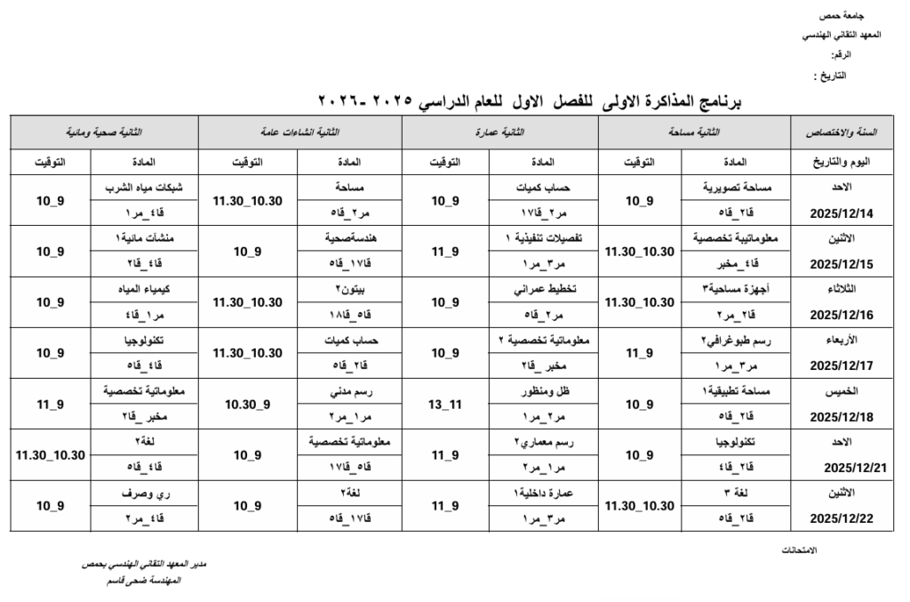 برنامج مذاكرات السنة الثانية للفصل الأول من العام الدراسي 2025/2026 في المعهد التقاني الهندسي