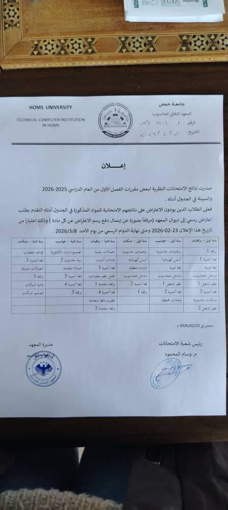 أخبار معهد الحاسوبإعلانات هامة اعلان موعد الاعتراض على نتائج المواد التي صدرت الموجودة بالجدول المعهد التقاني للحاسوب 23 فبراير، 2026 662 23 فبراير، 2026 662