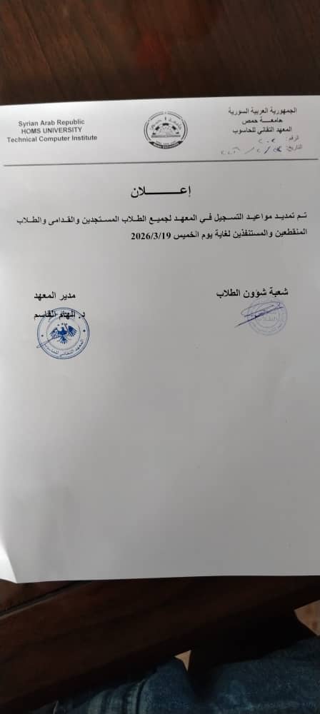 أخبار معهد الحاسوبإعلانات هامة اعلان تمديد التسجيل للطلاب القدامى والمستجدين والمنقطعين والمستنفذين طلاب المعهد التقاني للحاسوب 25 فبراير، 2026 610 25 فبراير، 2026 610