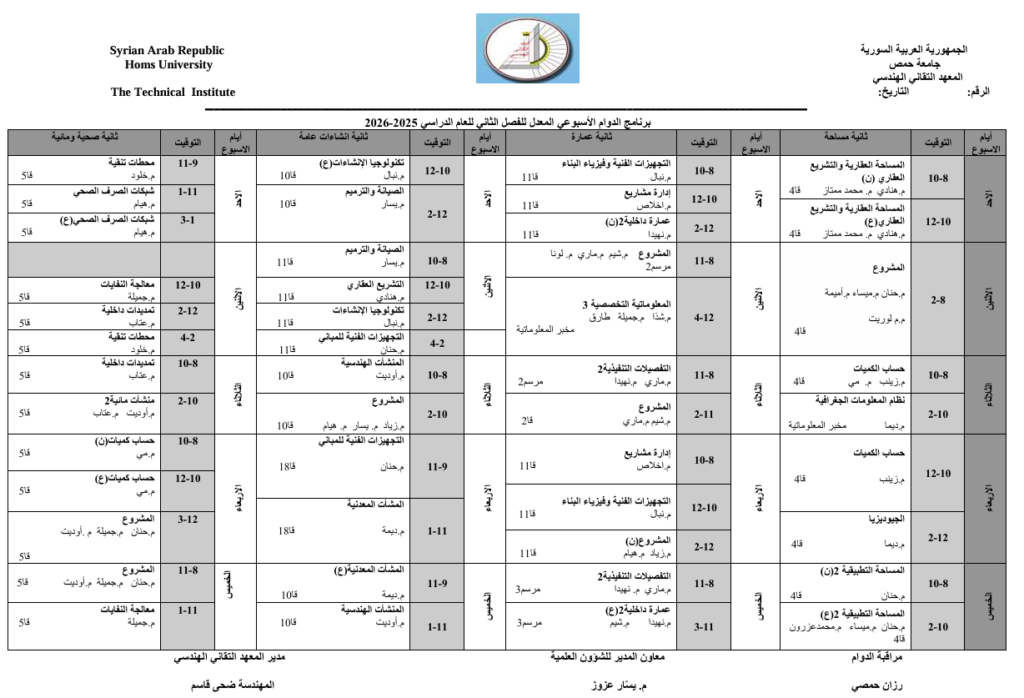أخبار عامةأخبار معهد الهندسيإعلانات هامةغير مصنف برنامج الدوام الاسبوعي المعدل للفصل الدراسي الثاني من العام الدراسي 2025/2026 في المعهد التقاني الهندسي 26 فبراير، 2026 269 26 فبراير، 2026 269