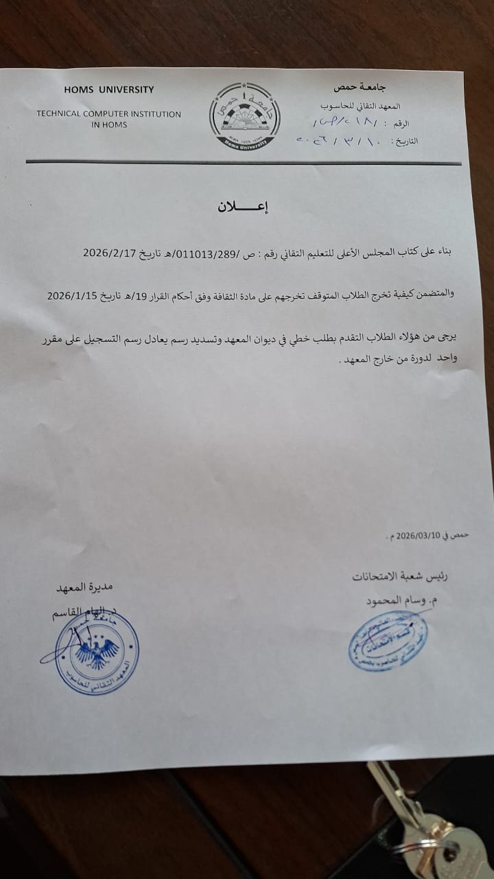 أخبار معهد الحاسوبإعلانات هامة اعلان للطلاب الذين توقف تخرجهم على مادة الثقافة طلاب المعهد التقاني للحاسوب 11 مارس، 2026 161 11 مارس، 2026 161