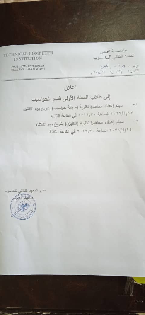 أخبار معهد الحاسوبإعلانات هامة اعلان الى طلاب السنة الاولى اختصاص حواسيب طلاب المعهد التقاني للحاسوب 9 أبريل، 2026 261 9 أبريل، 2026 261