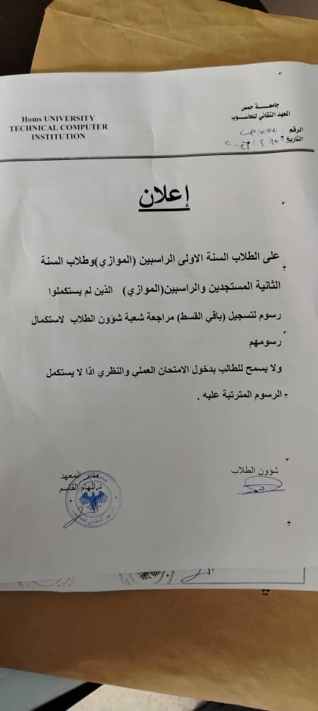 أخبار معهد الحاسوبإعلانات هامة اعلان استكمال رسوم (لطلاب السنة الاولى الرسبين وطلاب السنة الثانية المستجدين والراسبين موازي ) طلاب المعهد التقاني للحاسوب 15 أبريل، 2026 165 15 أبريل، 2026 165