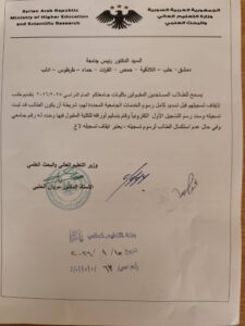 على ان يكون سدد رسم ٢٥٠ل.س لتثبيت مقعده و قام بتسليم اوراق تسجيله للكلية