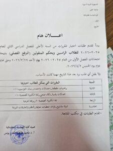 إعلاناتشريط الأخبار اعلان هام – تقديم طلبات اختيار المقررات من السنة الاعلى للفصل الثاني للعام الدراسي 2025-2026 26 مارس، 2026 15 26 مارس، 2026 15