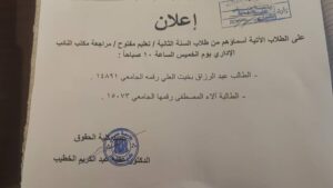 أخبار عامةشريط الأخبار اعلان للطلاب الاتية مراجعة مكتب النائب الاداري الأربعاء 2 ربيع الثاني 1447هـ 24-9-2025م 594 الأربعاء 2 ربيع الثاني 1447هـ 24-9-2025م 594