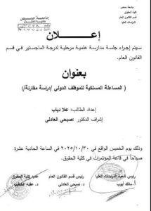أخبار عامةشريط الأخبارماجستير القانون العام إعلان إجراء جلسة مدارسة علمية مرحلية لدرجة الماجستير في قسم القانون العام للطالبة علا دياب الأثنين 5 جمادى الأولى 1447هـ 27-10-2025م 222 الأثنين 5 جمادى الأولى 1447هـ 27-10-2025م 222