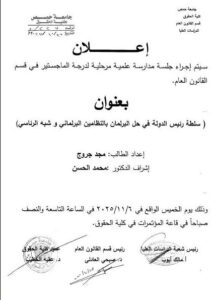 أخبار عامةشريط الأخبارماجستير القانون العام إعلان إجراء جلسة مدارسة علمية مرحلية لدرجة الماجستير في قسم القانون العام للطالب مجد جروج الأثنين 5 جمادى الأولى 1447هـ 27-10-2025م 251 الأثنين 5 جمادى الأولى 1447هـ 27-10-2025م 251