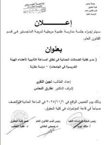 أخبار عامةشريط الأخبارماجستير القانون العام إعلان إجراء جلسة مدارسة علمية مرحلية لدرجة الماجستير في قسم القانون العام للطالبة لجين النقري الأثنين 5 جمادى الأولى 1447هـ 27-10-2025م 368 الأثنين 5 جمادى الأولى 1447هـ 27-10-2025م 368