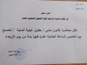أخبار عامةشريط الأخبار اعلان هام لطلاب السنة الرابعة /كلية الحقوق/ التعليم العام الأربعاء 7 جمادى الأولى 1447هـ 29-10-2025م 618 الأربعاء 7 جمادى الأولى 1447هـ 29-10-2025م 618
