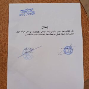 أخبار عامةشريط الأخبار اعلان هام للطالب عمار حسن سليمان /س1/ تعليم عام / الرقم الجامعي12313 الخميس 8 جمادى الأولى 1447هـ 30-10-2025م 857 الخميس 8 جمادى الأولى 1447هـ 30-10-2025م 857