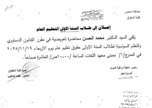 أخبار عامةبرنامج الدوام الاسبوعيشريط الأخبار اعلان لطلاب السنة الاولى /التعليم العام الأثنين 26 جمادى الأولى 1447هـ 17-11-2025م 195 الأثنين 26 جمادى الأولى 1447هـ 17-11-2025م 195