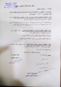أخبار عامةبرنامج الدوام الاسبوعيشريط الأخبار المطلوب والمحذوف لامتحانات الفصل الأول للعام الدراسي 2025/2026 لمقررات/ الأحوال الشخصية قسم الزواج وآثاره س 2/ مقرر قانون العقوبات العام 1 س 1/ مقرر الاقتصاد السياسي س 1 6 يناير، 2026 1٬263 لمعاينة الملف اضغط على الرابط المطلوب والمحذوف من مقررات د فيصل الحكيم 6 يناير، 2026 1٬263