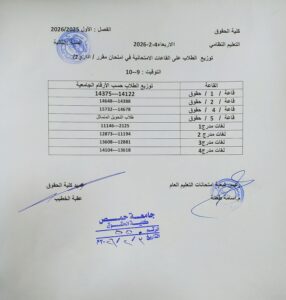 أخبار النتائج الإمتحانيةأخبار عامةشريط الأخبار توزيع الطلاب على القاعات الامتحانية في مقرر/ إداري 2 / ليوم الاربعاء 4/2/2026 3 فبراير، 2026 949 3 فبراير، 2026 949