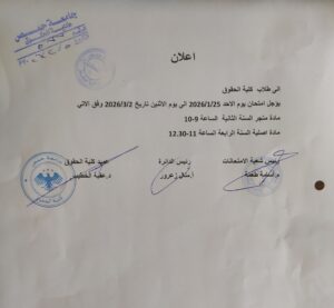 أخبار عامةإعلاناتبرنامج الامتحاناتشريط الأخبار اعلان هام بخصوص تحديد مواعيد الامتحانات المؤجلة 5 فبراير، 2026 578 5 فبراير، 2026 578