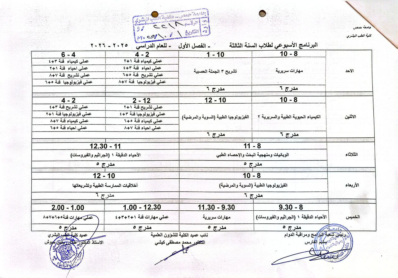 برنامج الدوام الأسبوعي للفصل الأول من العام الدراسي ٢٠٢٥-٢٠٢٦