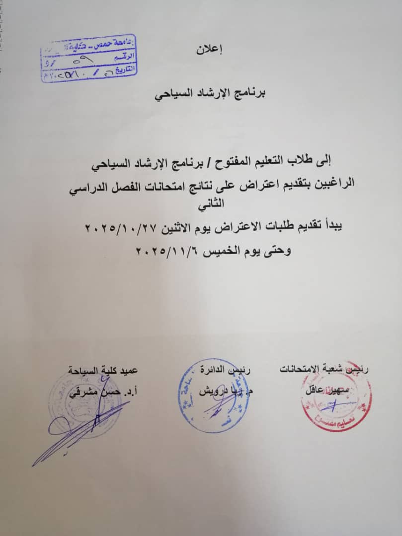 - إعلان هام بخصوص تقديم طلبات الاعتراض على نتائج امتحانات الفصل الثاني لبرنامج الارشاد السياحي
