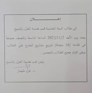 إعلاناتشريط الأخبار مشاريع التخرج وإعلان هام لطلاب السنة الخامسة هندسة الغزل والنسيج الخميس 8 جمادى الأولى 1447هـ 30-10-2025م 193 CamScanner ٣٠-١٠-٢٠٢٥ ٢٠.٠٤ (2) الخميس 8 جمادى الأولى 1447هـ 30-10-2025م 193