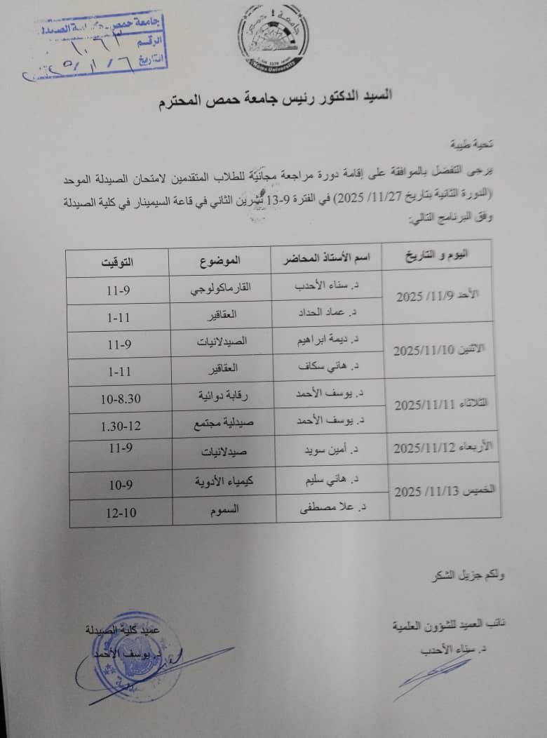 .أخبار عامةشريط الأخبار اعلان هام للطلاب المتقدمين لامتحان الصيدلة الموحد الخميس 15 جمادى الأولى 1447هـ 6-11-2025م 27 الخميس 15 جمادى الأولى 1447هـ 6-11-2025م 27