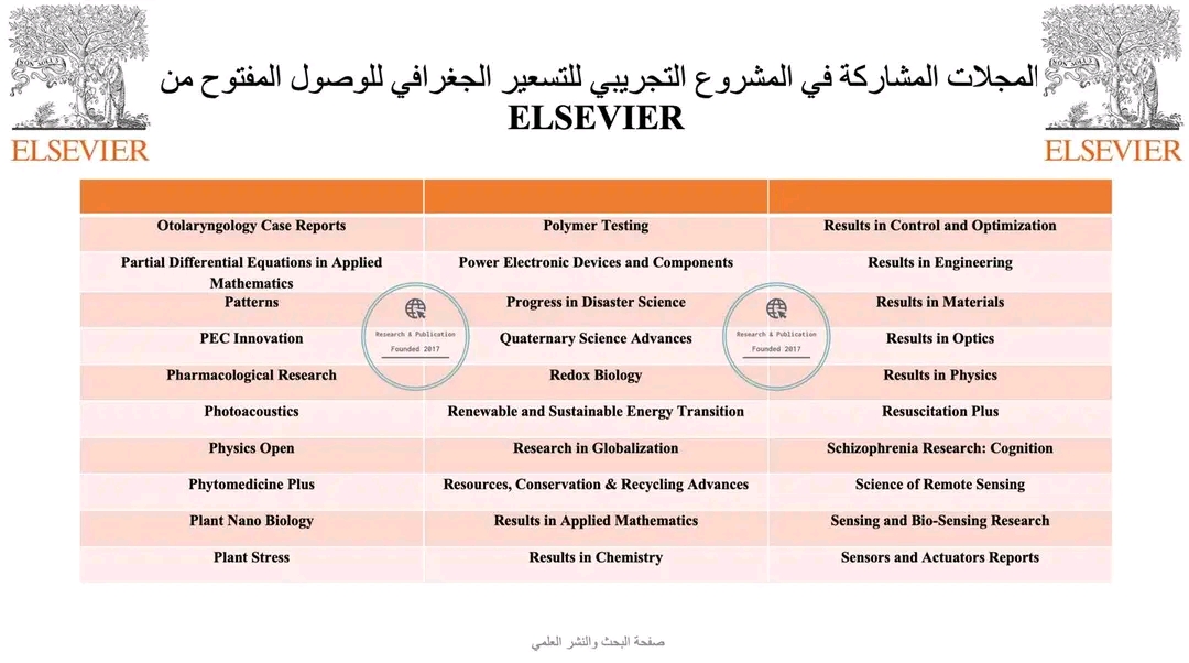 - دار النشر الهولندية Elsevier تطلق برنامج تجريبي لعدد من مجلاتها مفتوحة بأجور مجانية للباحثين من سورية