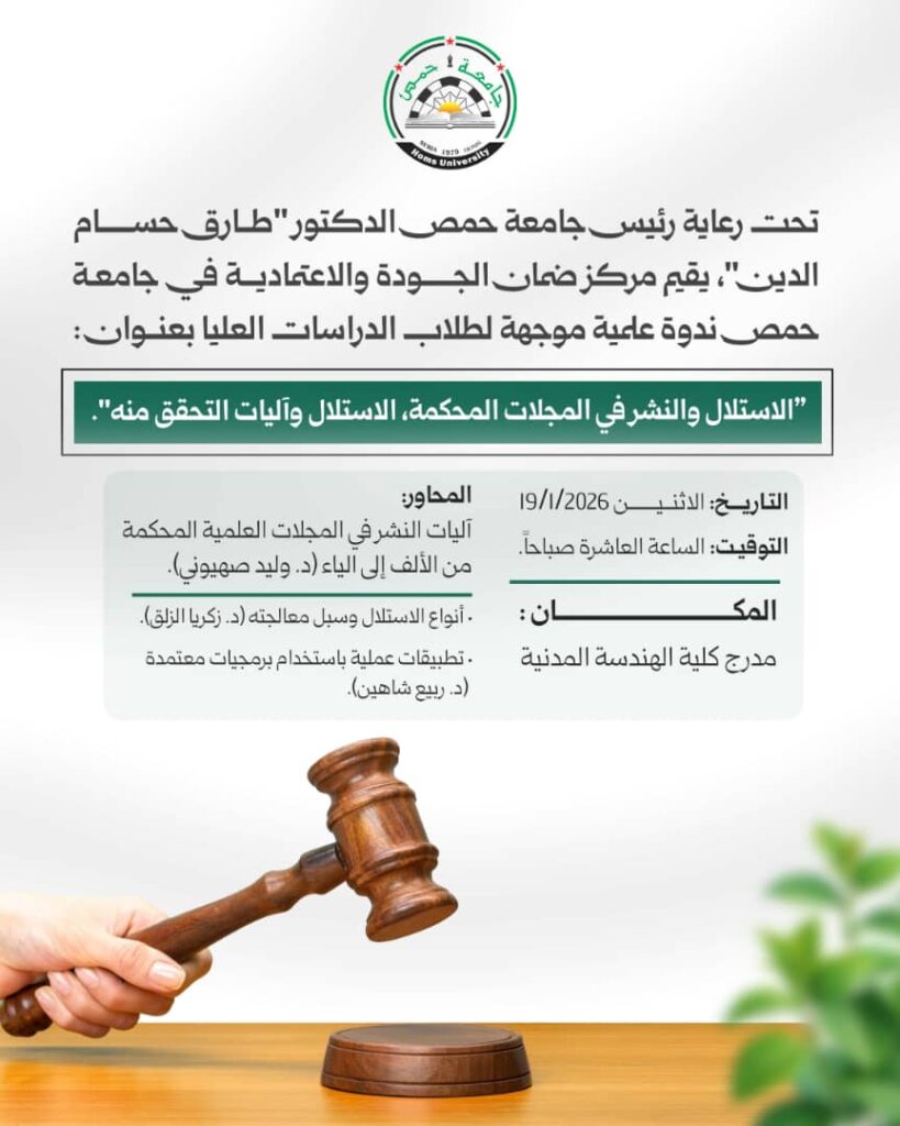 تحت رعاية رئيس جامعة حمص الدكتور طارق حسام الدين، يقيم مركز ضمان الجودة والاعتمادية في جامعة حمص ندوة علمية موجهة لطلاب الدراسات العليا بعنوان”الاستلال والنشر في المجلات المحكمة، الاستلال وآليات التحقق منه”