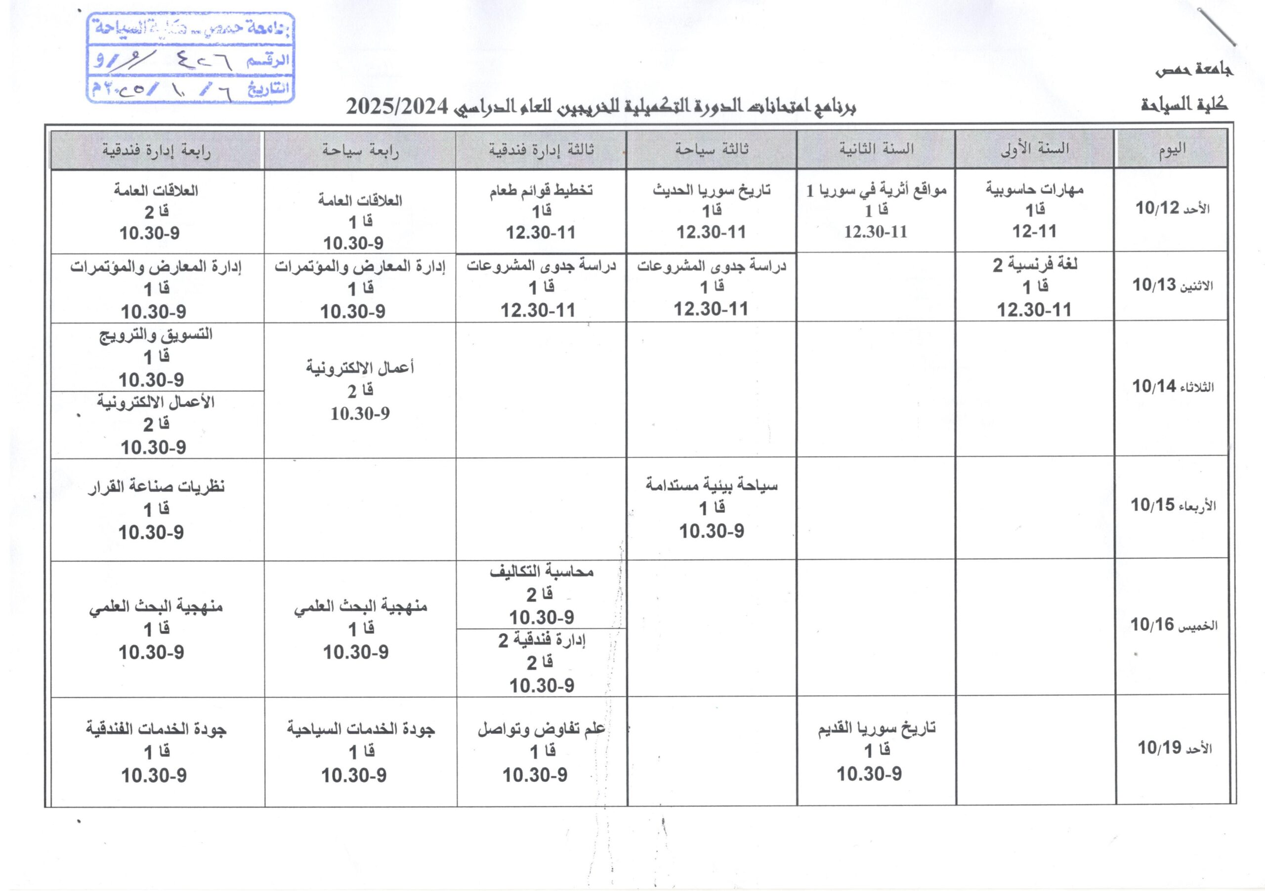 برنامج امتحانات الدورة التكميلية للخريجين للعام الدراسي 2024-2025