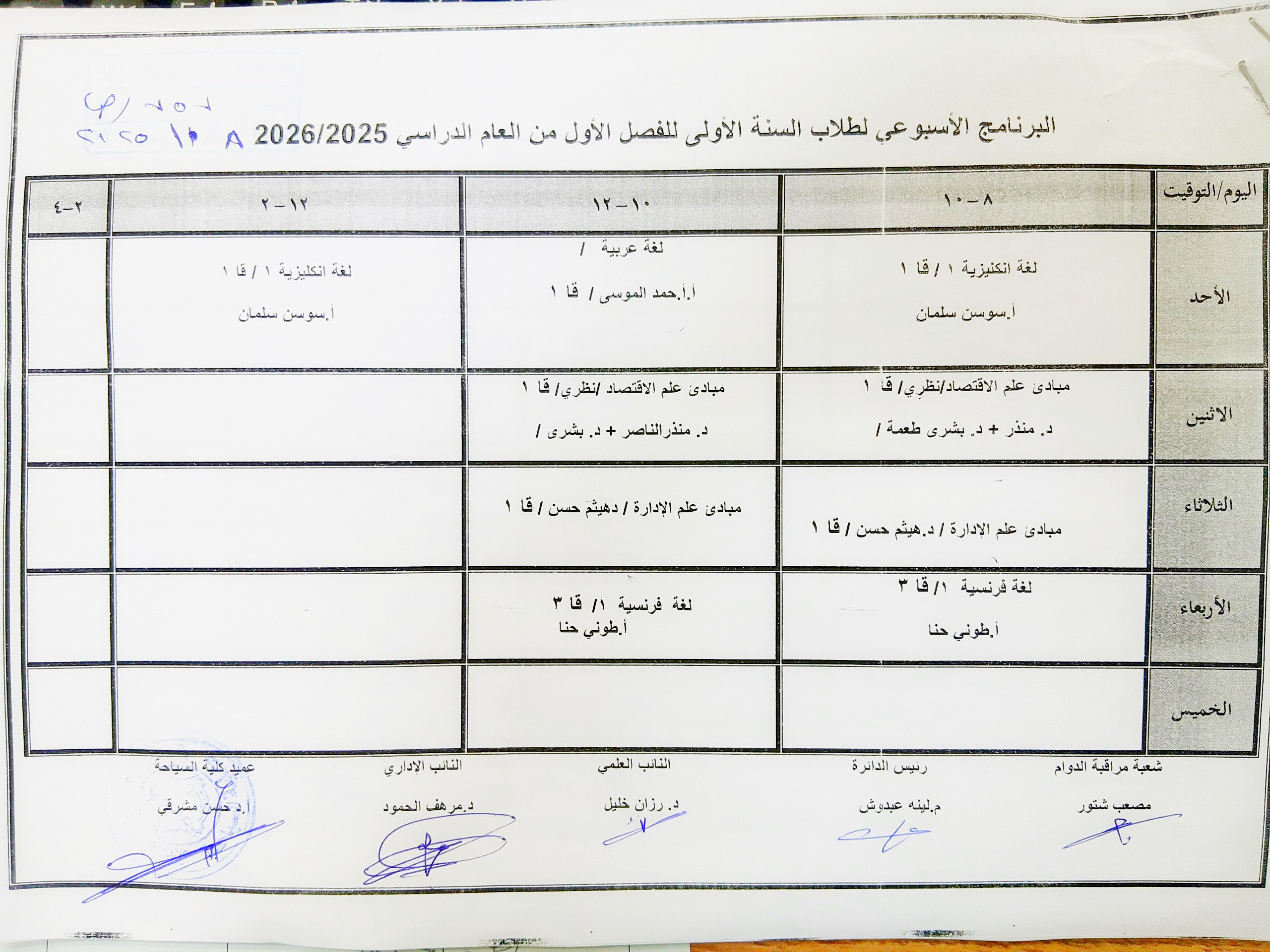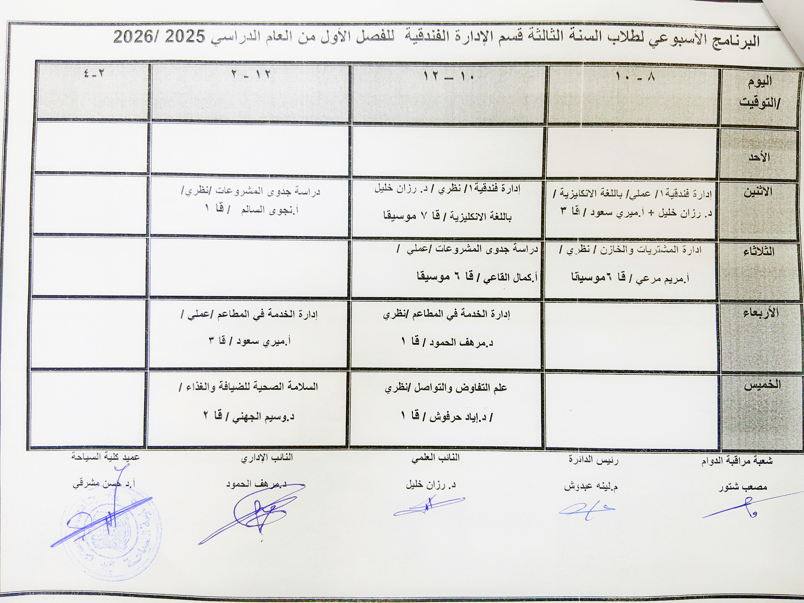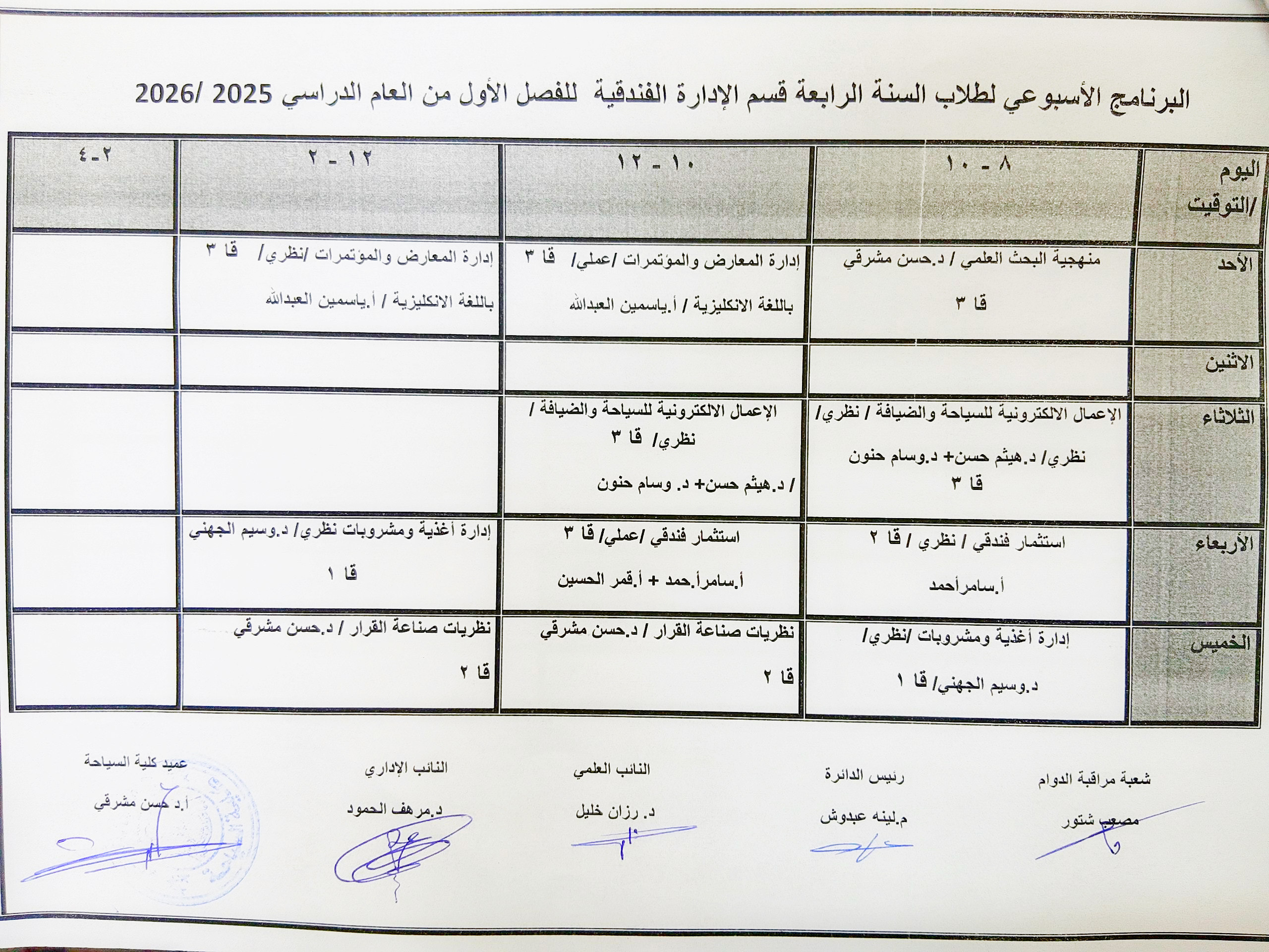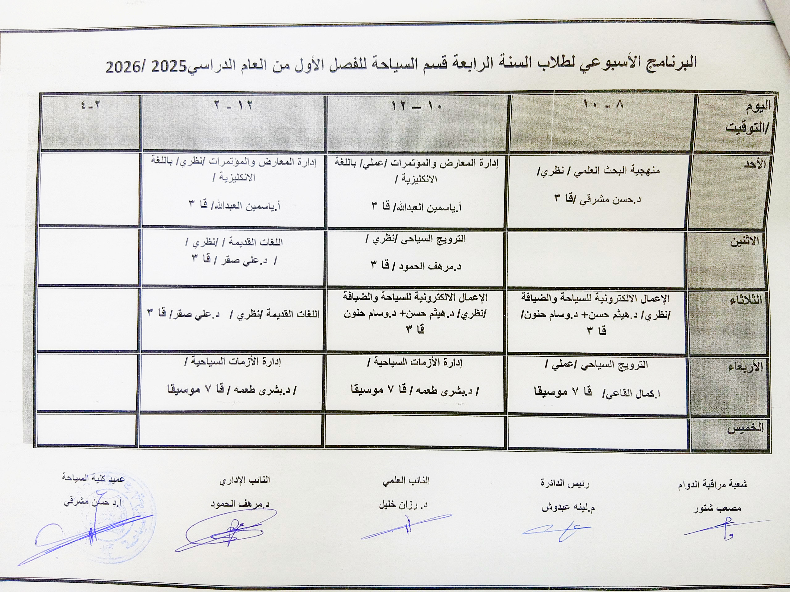 البرنامج الاسبوعي النهائي لكلية السياحة للفصل الدراسي الأول من العام 2025-2026