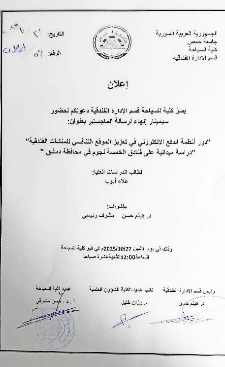 إعلان لحضور سيمنار إنهاء لرسالة الماجستير للطالب علاء أيوب
