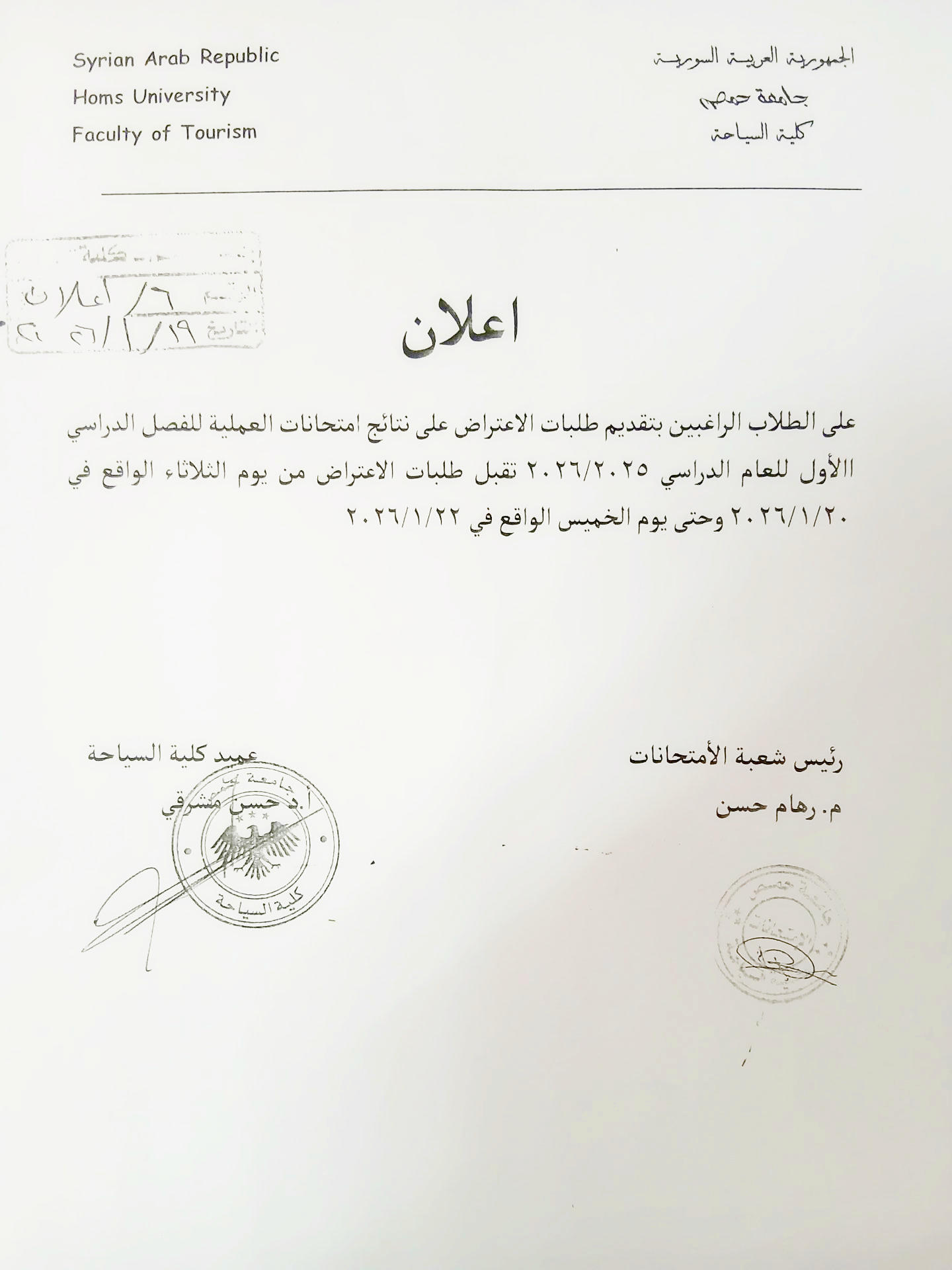 أخبار عامةإعلانات إعلان هام بخصوص تقديم طلبات الاعتراض على علامات العملي 21 يناير، 2026 463 إعلان هام بخصوص تقديم طلبات الاعتراض على علامات العملي 21 يناير، 2026 463