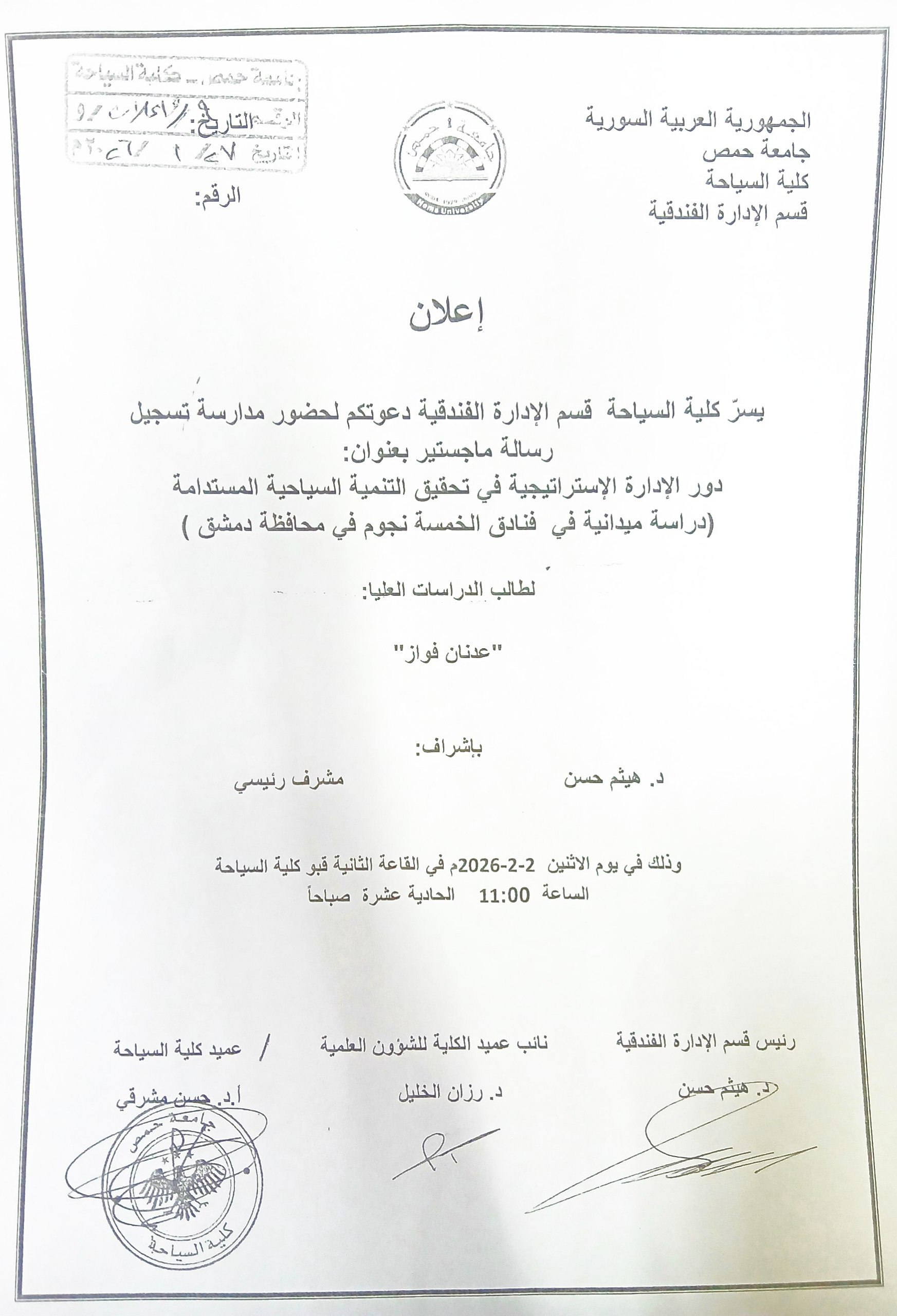 إعلان لحضور مدارسة تسجيل لرسالة الماجستير للطالب عدنان فواز