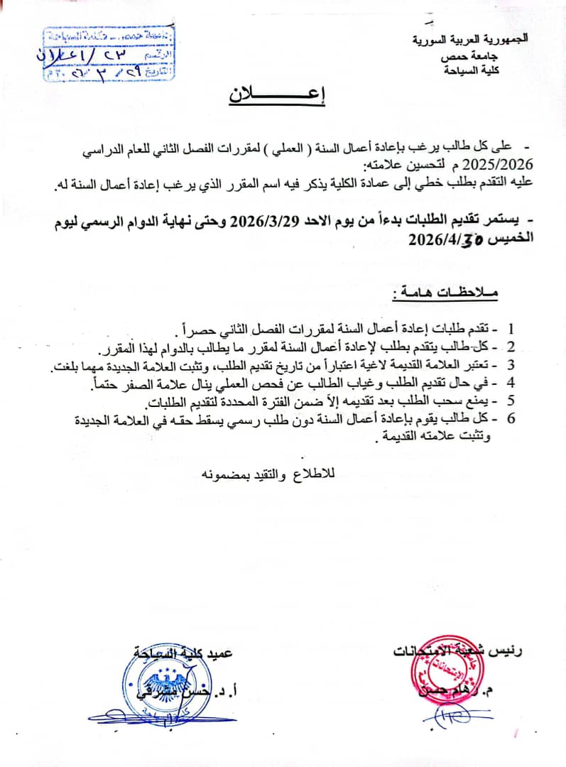 إعلان هام بخصوص تقديم طلبات إعادة العملي لمقررات الفصل الثاني