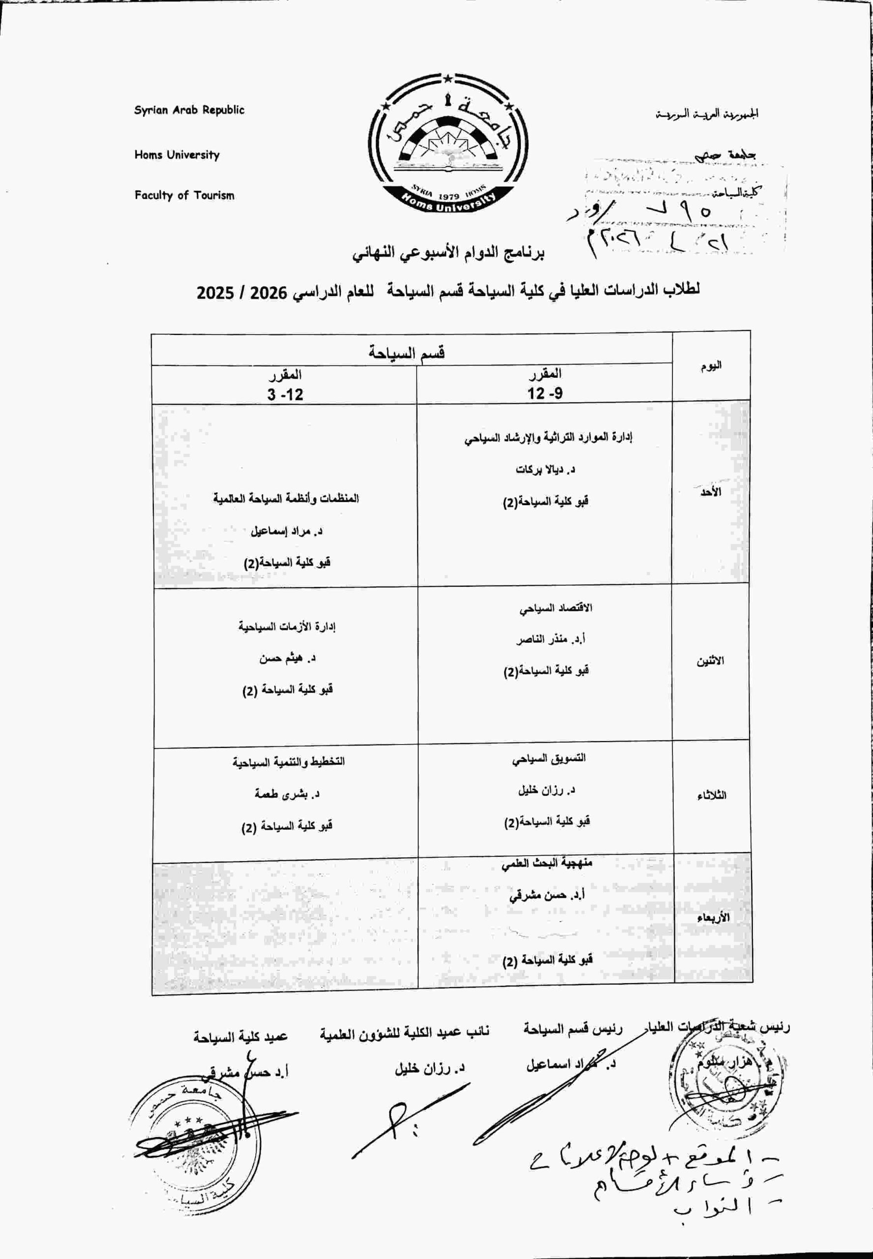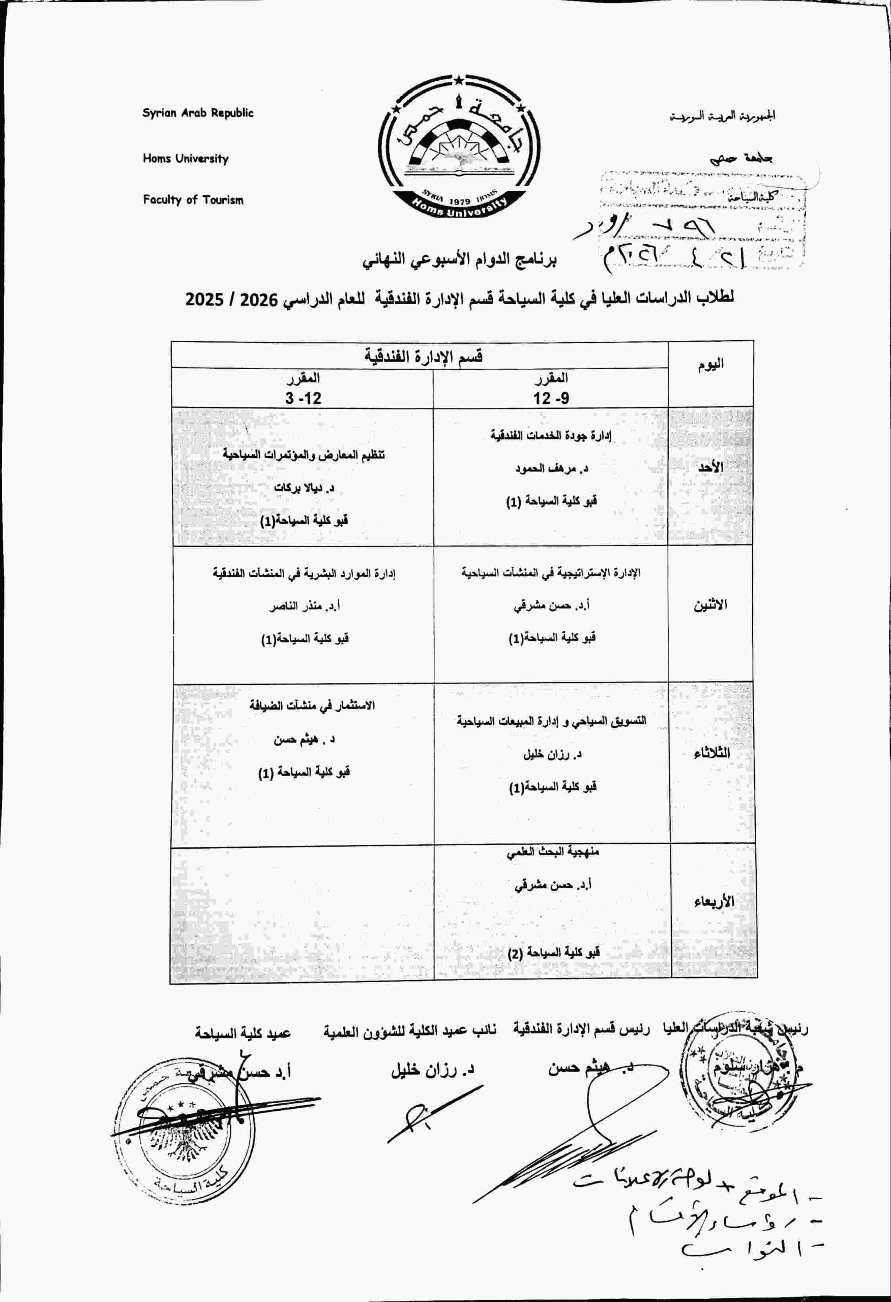 برنامج الدوام الأسبوعي لطلاب الدراسات العليا للعام الدراسي 2025-2026